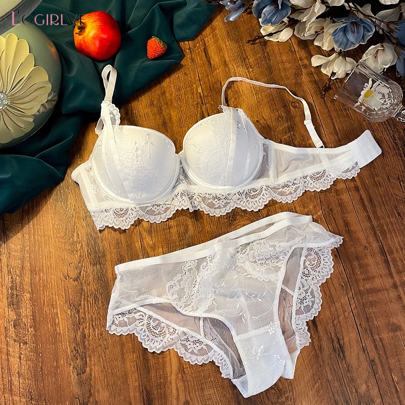 Logirlve Embroidery Sexy Underwear Set Lace Brassiere Deep V Thick Cotton Women Push Up Bra and Panties Set Brand Lingerie