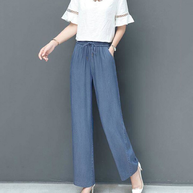Summer Thin Ice Silk Wide Leg Jeans For Women Fashion High Waist Lace Up Denim Pantalones Korean Loose Casual Straight Trousers