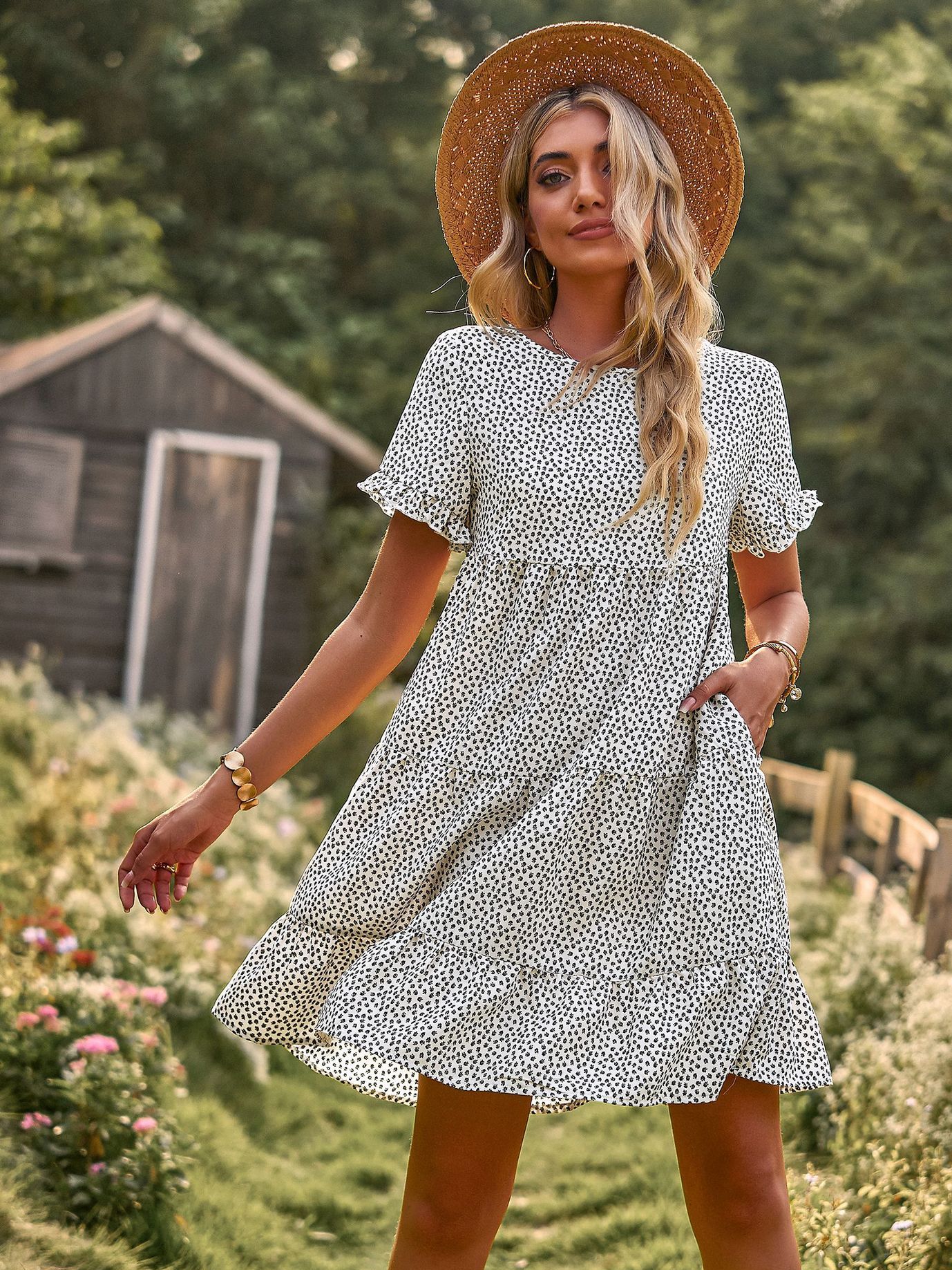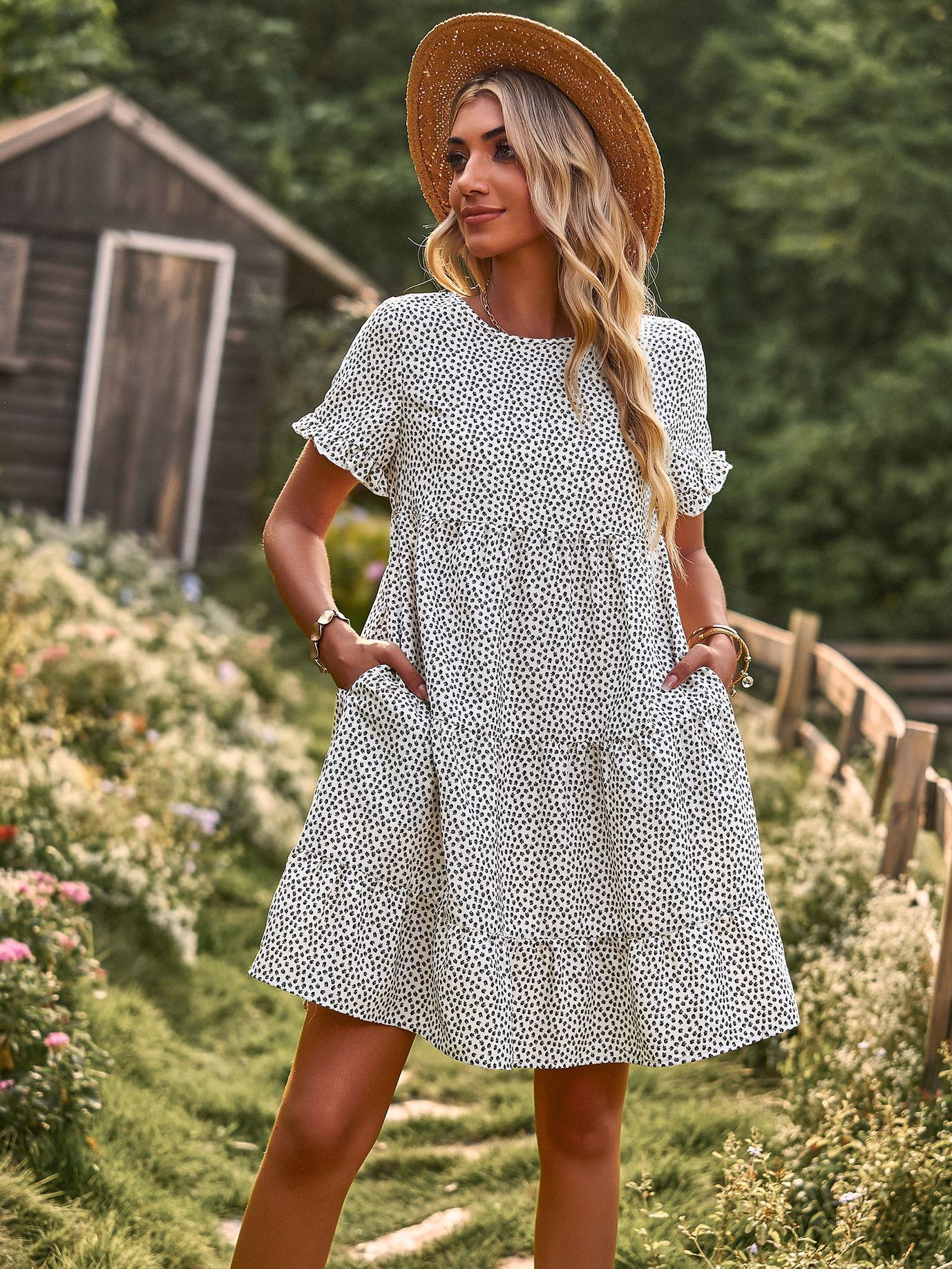 Summer Green Floral Print Ruffles Mini Dress Women Casual Round Neck Loose Vintage Dress Ladies Vacation Sundress Vestidos
